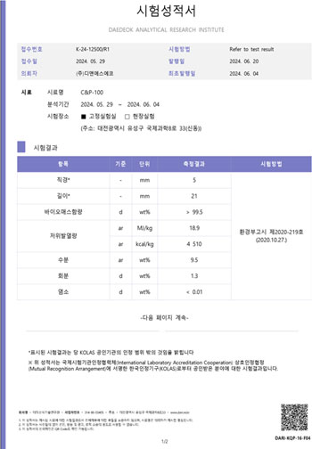 커피펠릿 시험성적서 고위발열량 5,240Kcal, 중금속 적합 판정